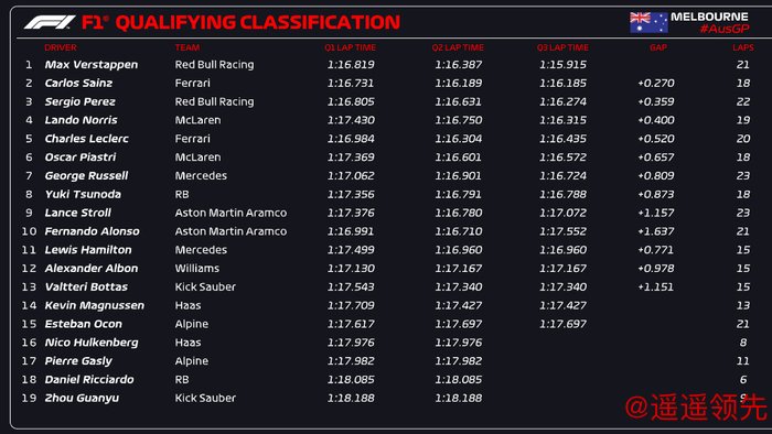 壹号娱乐下载 F1澳大利亚站维斯塔潘杆位 塞恩斯前排 周冠宇19